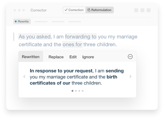 In Reformulation mode, Antidote comes up with smart solutions for reshaping your writing that stay true to your ideas. See your text transformed through different views that Rewrite, Retouch, Soften or Shorten it.
