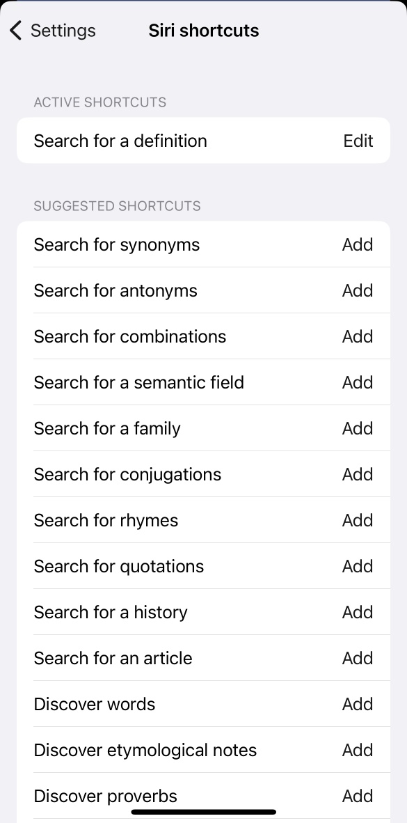 In iOS 16 and later, a few shortcuts are programmed so you can easily ask Siri to search or discover content in Antidote Mobile.