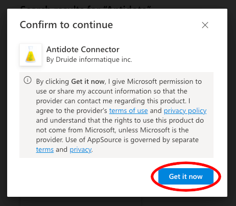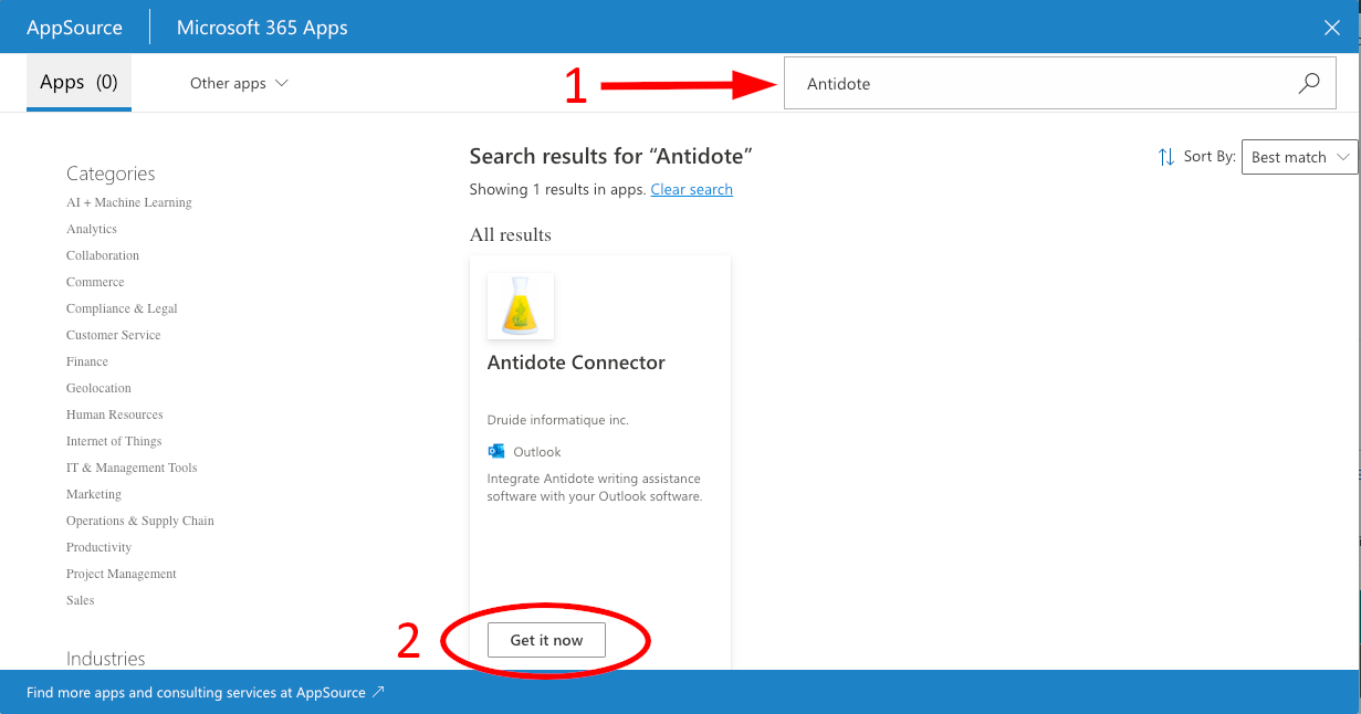 - A new window will open. Type Antidote in the search bar (1), then click the Get apps button (2) under the Antidote Connector result.