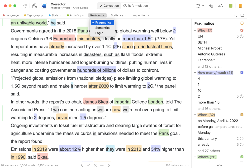 In a hurry? Review the Who, the How Many/Much, the When and the Where at a glance using the Pragmatics filter. This function allows you to focus on the information content, rather than the style or syntax. For example, it helps you see all the figures mentioned in your article and correct typos that could mislead your readers. The difference between 10,000 and 100,000 tons of CO2 is just one zero on paper, but the difference is huge when it comes to greenhouse gas production.