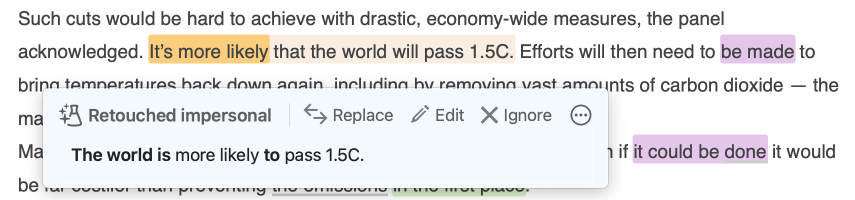 Impersonal constructions shouldn’t always be avoided, but sometimes they can lead to confusion about the subject or make the text feel clunky. To quickly spot impersonal phrases in your text, use the Constructions filter.
