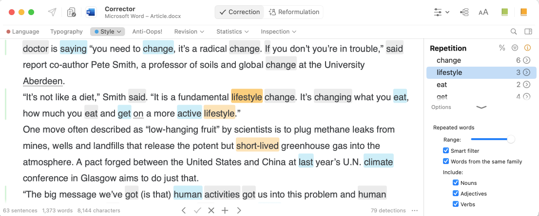 Luckily, the Repetition filter spots them for you right away. What’s more, clicking one of the repeated words yields a list of suggested synonyms. Select one from the list and Antidote will automatically replace the word in your text.