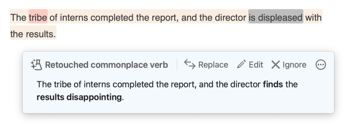 The Vocabulary filter highlights opportunities to refine word choices in your text. Among other things, it flags redundancies, informal or old-fashioned language that could deviate from the tone you’re aiming for, and inappropriate or offensive terms (sexist, homophobic, racist, etc.).