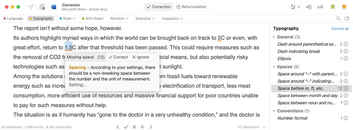 Each publication has its own typographical preferences. For example, some might use the em dash to separate parenthetical phrases, while others opt for the en dash. You can save several presets and choose among them directly from the corrector. This feature is great for journalists who write for multiple publications, ensuring a text will always meet a given outlet’s in-house standards.