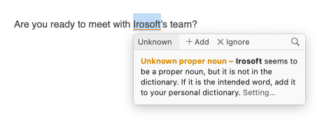 To add a word that Antidote’s corrector flags as unknown, click the + Add command in the tooltip for the detection. If you have several personal dictionaries, Antidote will ask you to specify the one to which you would like to add your word. The word will be inserted in the appropriate field of the entry form and Antidote will analyze its use in your text to assign it a particular syntactic category and to configure the entry automatically.