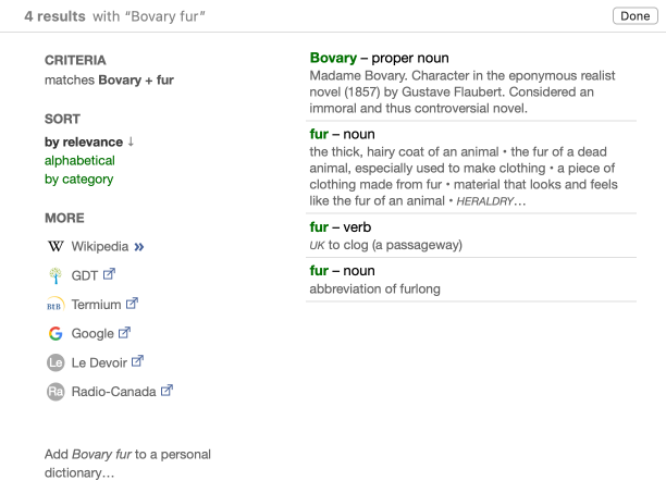 A similar link is displayed at the top of the main panel of the dictionary of definitions when you search for a word that already appears in one of your personal dictionaries; it invites you to edit the entry in question. If needed, click the link to change the word’s category, expand or correct its definition, review its characteristics, etc.