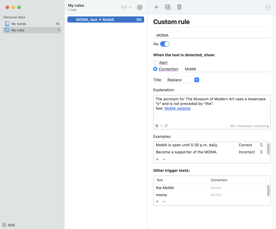 A rule consists of a trigger, a detection type, an optional replacement word and an explanation. It generates a detection, which can be defined as either an alert or a correction. You can also illustrate the rule by adding examples of correct and incorrect use. You can even supplement the rule with other similar triggers that can produce different corrections.