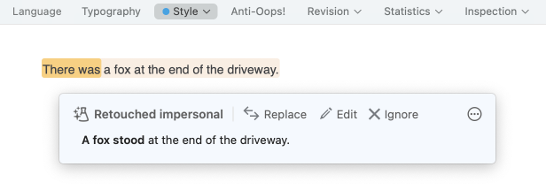If you would like, Antidote proposes reformulations for passive, impersonal, negative and wordy constructions. To see the suggested reformulations for these detections, click the Reformulate command in the corresponding tooltip.