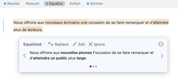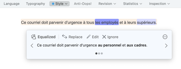 The Equalize view provides suggestions for reformulating your writing in French that are more inclusive because they don’t use the generic masculine form nor rely on traditionally gendered nouns. When generating reformulations, Antidote follows the recommendations set out in its own guides and uses the widest possible range of approaches to inclusivity: