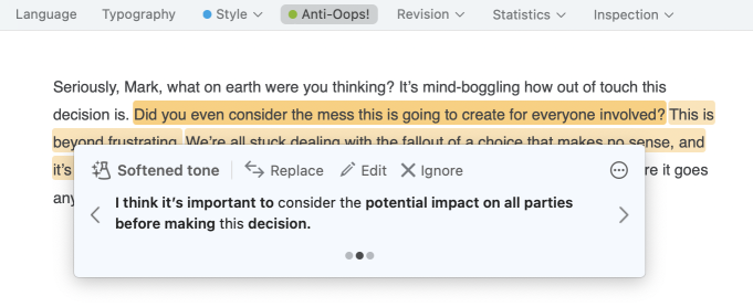 The Soften view is linked to the Anti-Oops! view in Correction mode, which also offers suggestions for rewording flagged passages. To reformulate your writing more broadly, click the magic flask icon () in the Anti-Oops! detection’s tooltip to switch over to Reformulation mode, where you can choose from additional reformulation options.