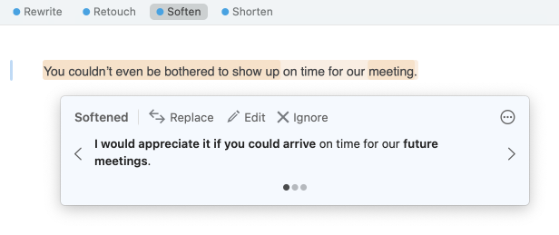 Because feelings can be expressed in different ways, Antidote usually offers several options for reformulating a given passage. Soften organizes these reformulation suggestions in the tooltip, from the one most faithful to the source to the most creative option, with fidelity based on the number and nature of the proposed changes. You can compare different suggestions and make your choice by clicking the chevrons on either side of the active reformulation or the grey dots beneath it.