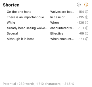 Antidote displays the total possible word and character counts after shortening at the bottom of the list of results (at the very bottom of the window’s right-hand panel), as well as the reduction in characters as a percentage. These numbers reflect the final length of the text should you choose to apply all the shortest reformulation options, letting you quickly know whether Shorten will sufficiently trim your text.