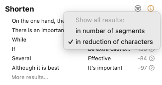 In the list of results (right-hand panel), Antidote displays all the passages in a text for which it is able to propose a shortened reformulation. The number of characters by which the original passage would be shortened appears to the right of its reformulation in this list. This provides you with an idea of just how much shorter the suggested reformulation is than the original. For the other views, the number of text segments changed by the proposed reformulation is displayed. If this second option is more relevant to your needs, you can click the icon (to the right of the panel title) to display it instead.