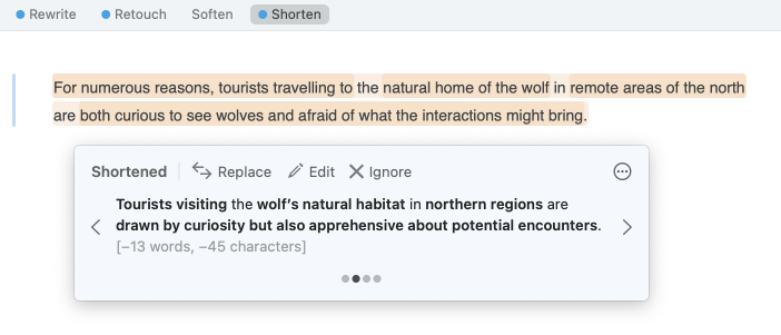 The Shorten view aims to streamline your text. It reformulates each paragraph to make it shorter but doesn’t stray from the original meaning. (A constituent sentence may be made longer, but the paragraph will be shorter overall.) It’s a great tool for when you need to limit your word count. Being able to express yourself succinctly in writing is an important skill; others will be able to read your work faster and understand it better.