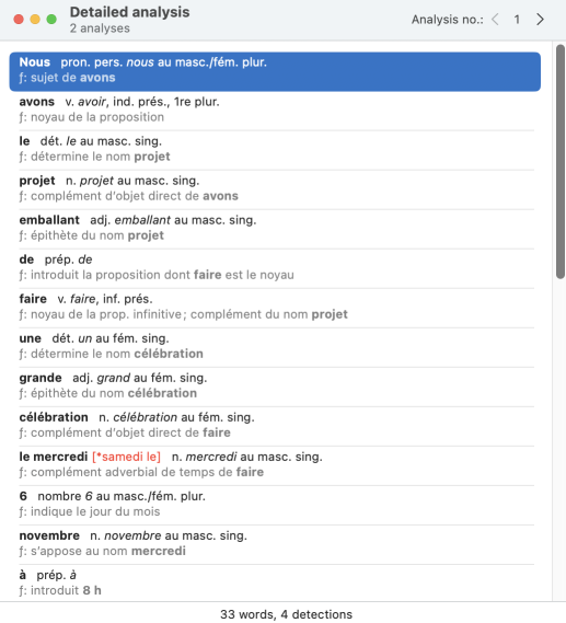 As in English, Antidote produces a detailed analysis of French sentences, with the difference that it employs certain notions that pertain to French grammar (e.g. épithète, genre, incise). For a clear definition of these terms, you can consult Antidote’s dictionaries.