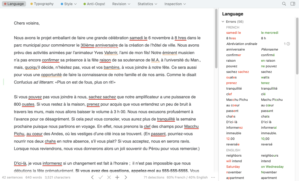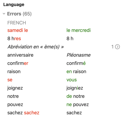 Important: the number and type of errors flagged by Antidote’s French corrector depend on your settings, including those defined under First language and Written French ability. Various other settings are found in both the English and the French versions; see the Settings section in this chapter for more details.