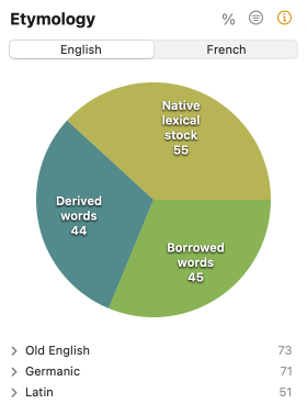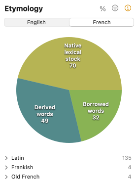 The National varieties filter that appears in the Inspection view for English does not exist in the French Module. However, the French Module does include three filters that don’t apply to English but are very relevant to French grammar: Agreement, which is far more complex in French; (grammatical) Genders; and Spelling rectifications. The Syntactic functions and Conjugation filters also differ with the French Module, owing to the differences between French and English grammars. You will also notice changes in the Etymology filter’s results (Statistics view), since far more words in French derive from Latin, Gaulish and Frankish origins.