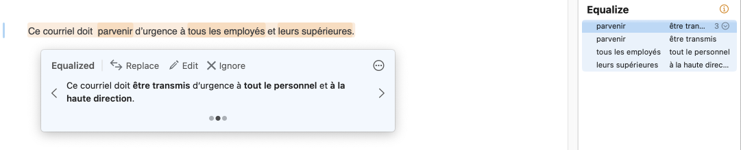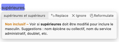 Antidote can generate reformulations for a variety of detections in the Style view. Notably for French, Antidote borrows reformulations from its Equalize view to provide you with gender-inclusive wording. Just click Reformulate in the tooltip.