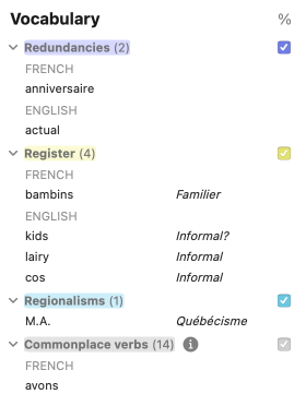 Certain filters feature two buttons, English and French, for multilingual texts. Clicking them lets you switch between the analyses of the French and English passages. The filters that display these buttons are (in the Statistics view) Error Types, Etymology and Categories; and (in the Inspection view) Categories, Phrases, Syntactic Functions and Conjugation.