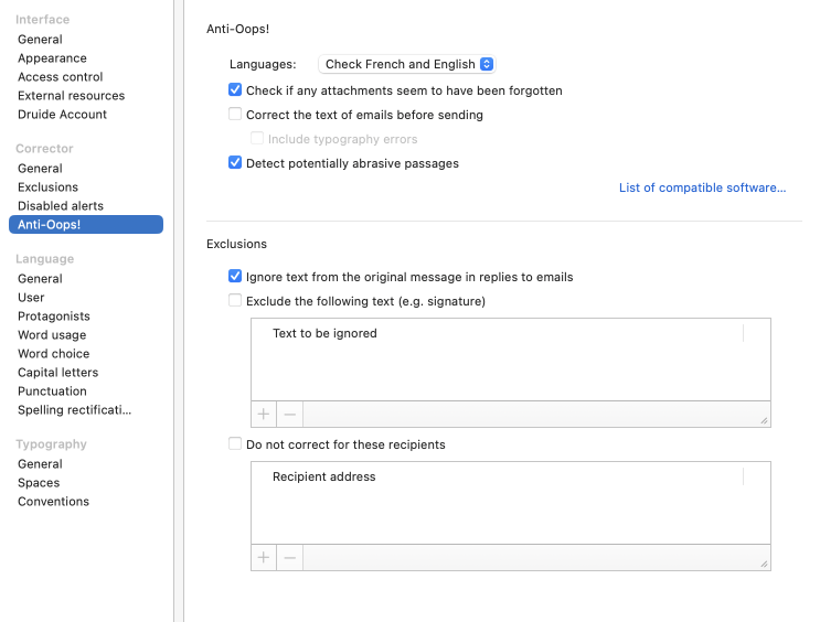 You can configure Anti-Oops! to correct only the French text in your emails, only the English text or both together. The appropriate features will be enabled according to the option you choose.