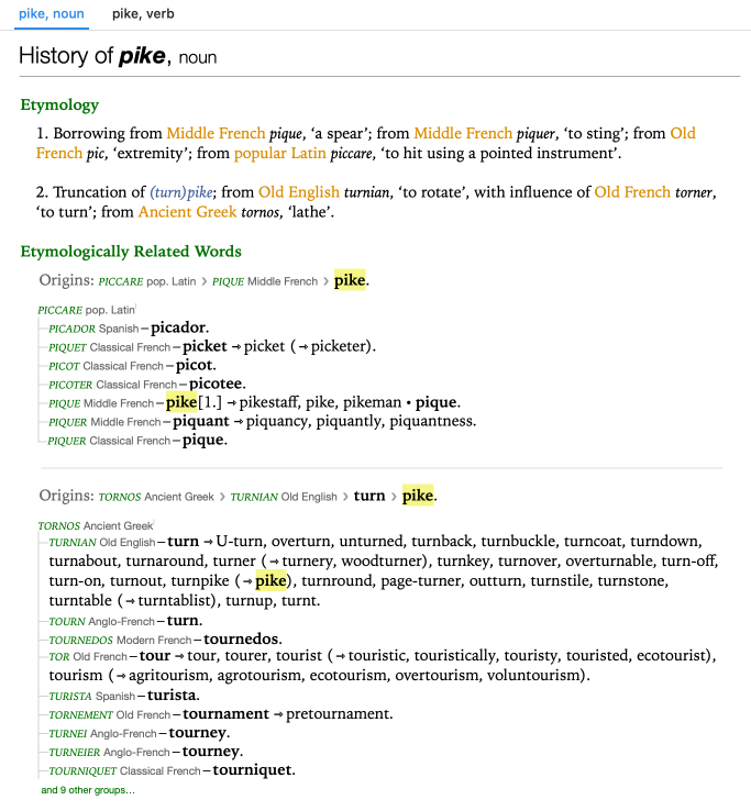 In some cases a word may have more than one etymology. Pike, for instance, is derived from popular Latin and Old English words. In these cases, the historical dictionary numbers the different etymologies (1., 2., 3., etc.) and may show more than one “family” of etymologically related words.