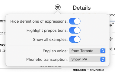 The button in the top right corner of the main panel of the dictionaries of definitions, synonyms and conjugations lets you configure some of the content (phonetic transcriptions, usage labels for synonyms, prepositions in examples, etc.), depending on the dictionary in question. Configuration options for each dictionary are described in the corresponding sections.