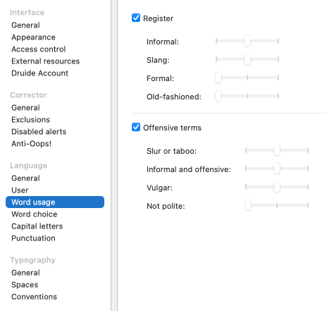 - Word usage settings are set to the intermediate level by default (except for the Formal and Old-fashioned registers, which are adjusted to the minimum level). To disable all alerts resulting from these settings without configuring each one individually, uncheck the appropriate boxes (in the top left corner of each panel section).