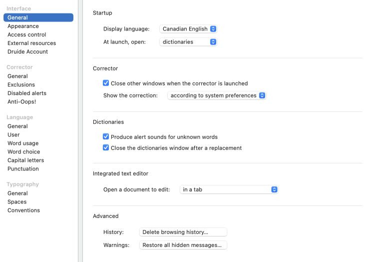 Select the language in which you want to view Antidote’s interface: English or French. You may also choose to base this option on your operating system language if set to English or French. Note that the linguistic content of Antidote’s reference works is not affected by this setting: Antidote always displays English linguistic content in English.