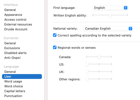 - When Antidote is first launched, you are asked to indicate your national language variety, and the slider corresponding to that variety is set to intermediate. For example, if you live in the United States, detection sensitivity for Regional words or senses is set to intermediate for regionalisms common to the US and to minimum for regionalisms from other areas of the world. To disable all alerts related to regionalisms without having to configure the setting for each variety individually, uncheck the box in the top left corner of this panel section.
