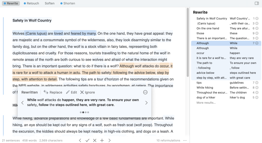 Make sure you want to apply all the changes proposed in a reformulation suggestion—a total reformulation—before clicking Replace or Ignore; you also have the option of applying only some changes with a partial reformulation. As an indicator, the extent of the orange highlighting differs for each of these two cases.