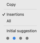 Antidote orders its suggested reformulations from the most faithful towards the original text to the most creative, and the first reformulation shown in the tooltip corresponds to the one Antidote judges to be the most relevant. The Initial suggestion option allows you to choose the creativity level of the reformulation shown first. Refer to the four grey dots, and keep in mind that the first corresponds to the lowest level of creativity (i.e. the most faithful to the original sentence) and the last corresponds to the most creative (i.e. the reformulation with the most changes compared to the original sentence).