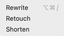 | Previous reformulation | click the previous reformulated passage | ⌥ + ⌘ + ← Alt + ← |