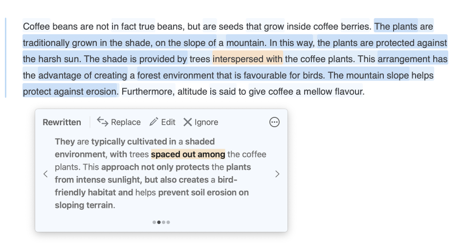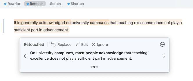 You can apply all the changes proposed in a reformulation suggestion when the entire passage is highlighted in orange. Note that none of the text displayed in the tooltip will be greyed out or highlighted in this case. Click Replace or, should you want to keep your original wording of the active passage, click Ignore.