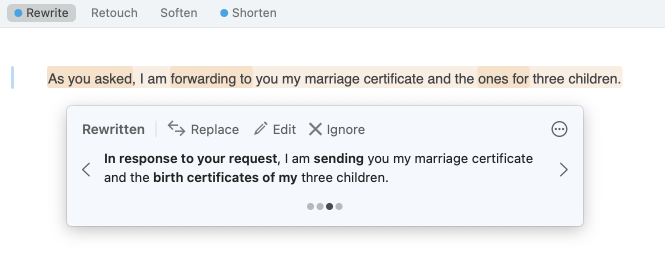 Antidote typically reformulates a passage in a variety of ways when its length allows. Rewrite organizes these reformulation suggestions in the tooltip, from the one most faithful to the source to the most creative option, with fidelity based on the number and nature of the proposed changes. You can compare different suggestions and make your choice by clicking the chevrons on either side of the active reformulation or the grey dots beneath it.