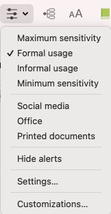 Presets allow you to quickly switch from one configuration of settings to another. They modify a number of different settings across multiple panels in a single operation. For a simple email to a friend, for example, you will probably opt for a tolerant combination of settings, e.g. Informal usage. For an official document, on the other hand, you will likely choose Formal usage or Maximum sensitivity.
