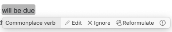 The reformulation tooltip has its own unique design with everything you need to reformulate the entire sentence or a portion of it. See the Handling a Reformulation page to learn more about its various components.