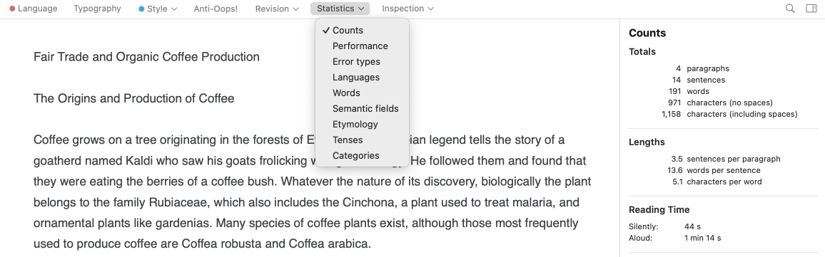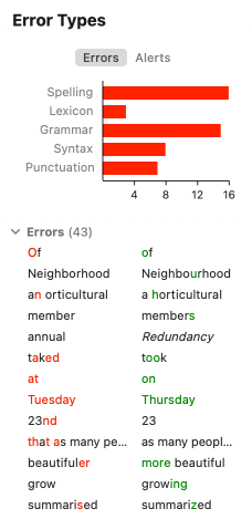 Error types separate language detections and group them into classes. Errors and alerts are presented in the form of histograms that indicate the number of detections for each class. Click the name of a class or the corresponding bar and a new histogram appears below it, providing a finer set of detections. When you do so, the corresponding errors are highlighted in the correction panel and are listed under the histograms, letting you concentrate on spelling errors, for example, or focus on the alerts related to capitalization.