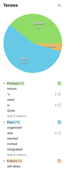 The Tenses filters show the number and distribution of verb tenses used in your text. Click one of the sections of the pie chart to highlight all occurrences of that verb tense in the correction panel.