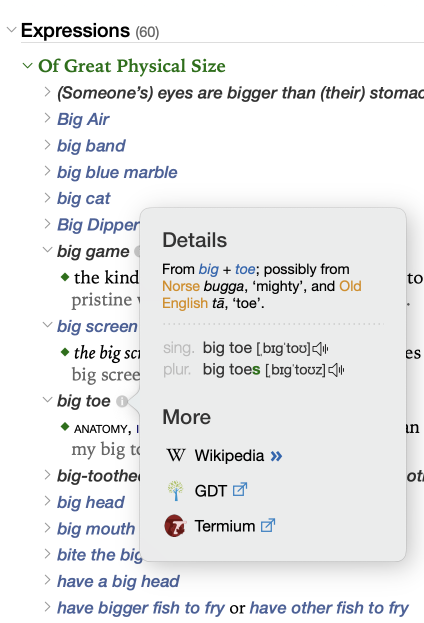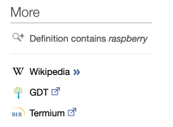 After reading a word’s definition, you may want to find out even more about it or to consult an encyclopedia. A link to the Wikipedia online encyclopedia is displayed in the More section of the right-hand panel for a noun or proper noun, and in the More section of the additional information bubble for the expressions in black (click the icon beside the expression to display it). The clickable expressions shown in blue include an External resources section in the details panel. Note that you must tick the Wikipedia checkbox in the External Resources Panel of the Interface Settings for this option to apply.
