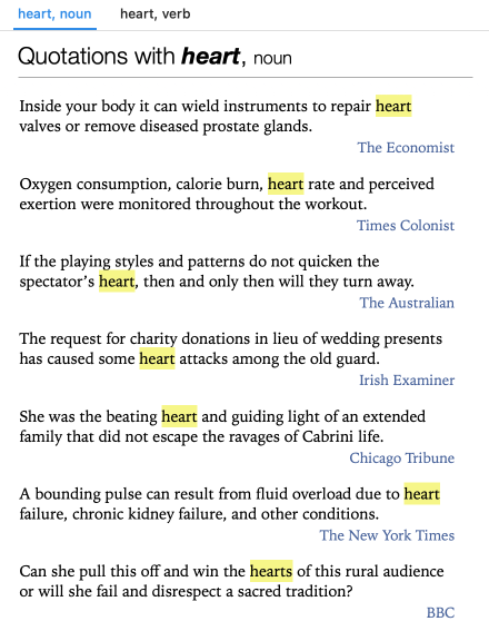 The dictionary provides up to fifteen quotations per word in chronological order, starting with literary ones and followed by examples from the media. Each quotation is accompanied by the name of the author (if applicable) and the title of the source from which it was taken. Click the hyperlinked text (in blue) to go to the homepage for that source online.