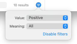 When the semantic fields are displayed as a list, clicking the button on the right side of the search filter lets you display or hide words with negative connotations (undrinkable, cheap), positive connotations (luxury, delicacy), strong meanings (delicious, luscious) or weak meanings (fine, good). Click the button again, then click Disable filters to return the list to its original state.