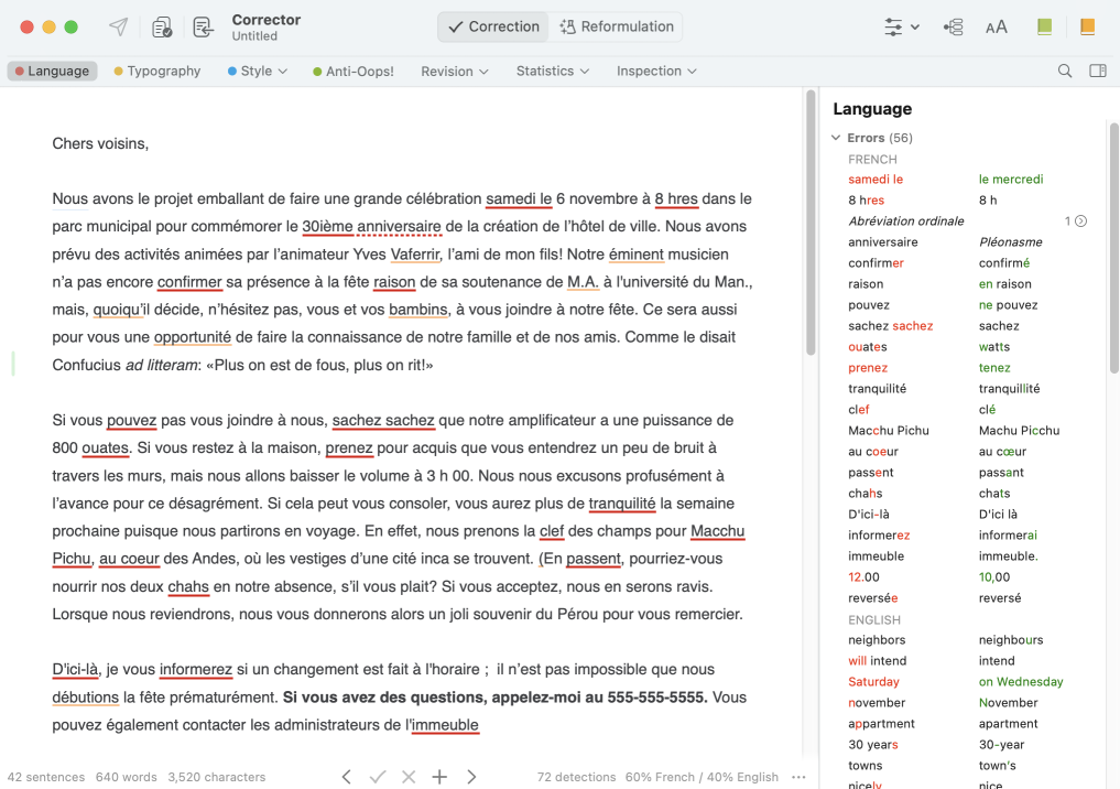 In Correction mode, Antidote can detect and correct errors specific to French for spelling, capitalization, grammatical agreement, spacing around punctuation marks and more. It also highlights important stylistic considerations for the French language.