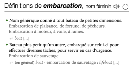 Formulations — Some translations are preceded by formulations in the source language, shown in roman type and followed by a colon. These formulations show the headword as part of a particular expression or construction. For example, one of the translations of the French entry embarcation is shown as “embarcation de sauvetage : lifeboat”. This shows users the full expression corresponding to one of the principal translations of the noun embarcation.