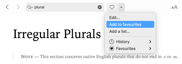 The favourites menu is accessible by clicking the heart icon to the right of the search field (). It displays a list of your favourite articles for quick access. To add an article to your favourites, open it in the guides window and do one of the following: