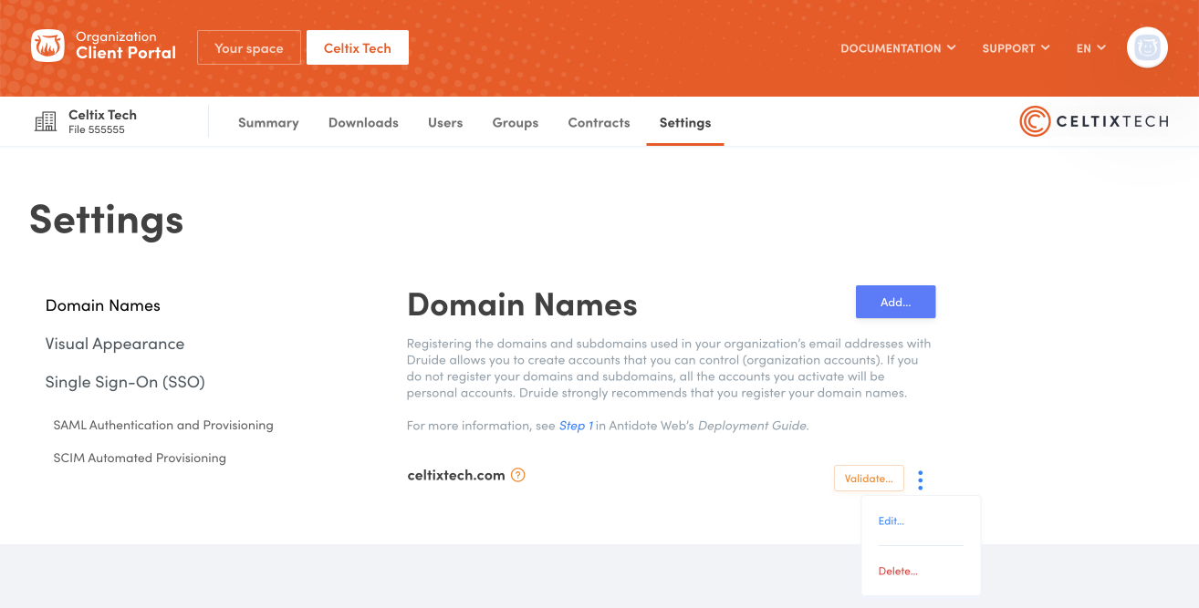 Every domain name has an actions button, consisting of three vertical dots (D), that allows you to Edit or Delete a domain name. The domain name will need to be verified again after you modify it.
