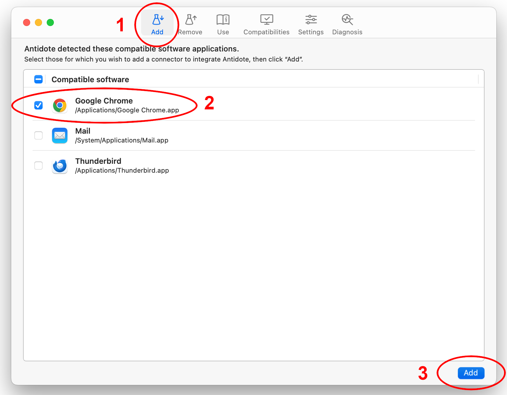 - In Connectix, select the Add tab (1), then check Google Chrome (2). Click on Add (3).