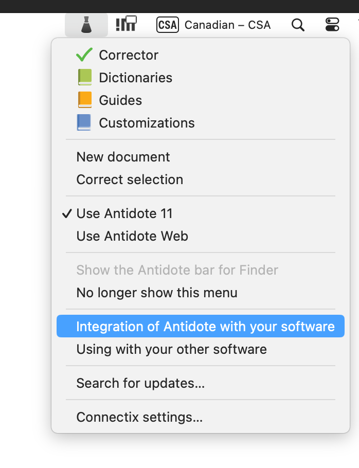 - First make sure that your browser is closed, then launch the Antidote Agent from the menu bar and select Integration of Antidote with your software.
