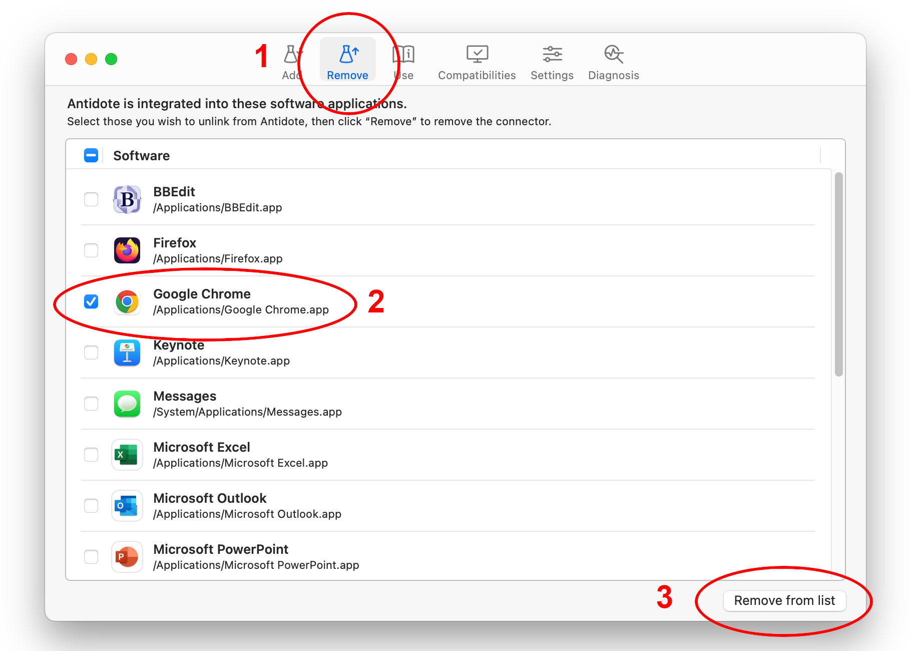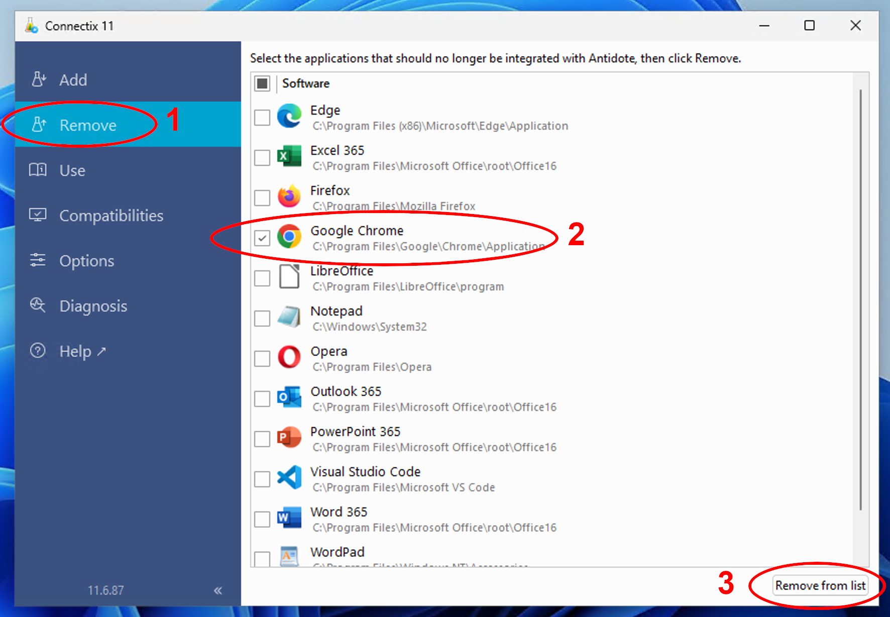 - In Connectix, select Remove from the left column (1), then check Google Chrome (2). Click on Remove from list (3).