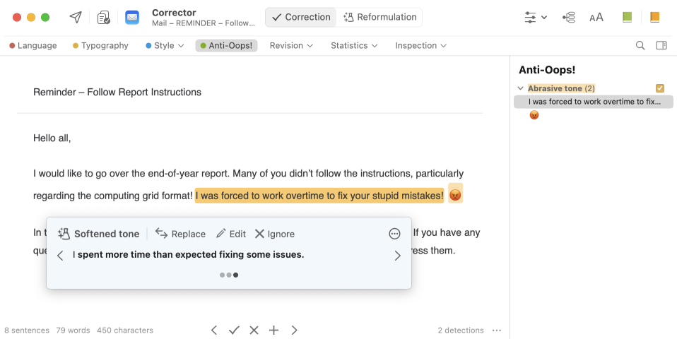 Anti-Oops! checks your email when you click Send. If your message contains errors or an abrasive tone that might be ill received by the recipient, the corrector opens automatically. Anti-Oops! also flags missing attachments. Just click the send button in the corrector once you have finished your revision.