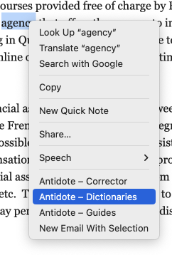 Select the text to correct or the word you want to look up, then right-click to open the context menu and select the Antidote tool you want to launch.